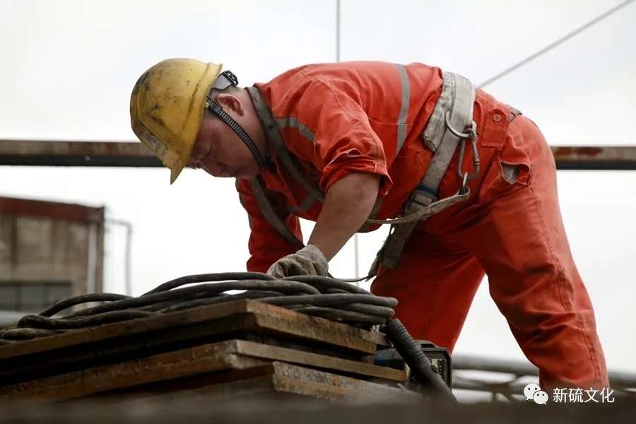 地面上大吊車、大貨車,選礦廠相關(guān)負(fù)責(zé)人、技術(shù)人員、安全員等忙著起吊龐然大物時,“焊高組”在底座上也一刻沒閑著,拖運電焊設(shè)備、準(zhǔn)備焊接材料、在底座上鋪水泥保持平面,各個槽體支腳找平衡......由于底座緊挨著磨浮車間,空氣不流通,加上天氣悶熱難擋,武裝整齊的好“焊”們一會就汗?jié)窳斯ぷ鞣?,汗珠順著安全帽壓著的發(fā)根往下滾。